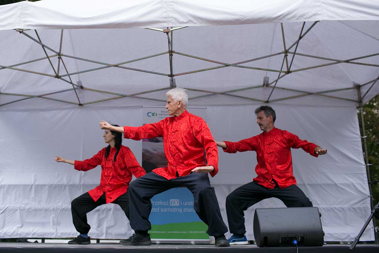 Są występy seniorów na scenie, pokazy mody, dyskoteka z DJ Wiką oraz niezliczone atrakcje, mieszczące się w namiotach otaczających główny plac spotkania. Nie zabrakło i w tym roku naszego pokazu formy taiji i form z bronią. Ćwiczyliśmy też, jak w ubiegłe lata, na łące, doskonaląc tym razem rozgrzewkę kija.