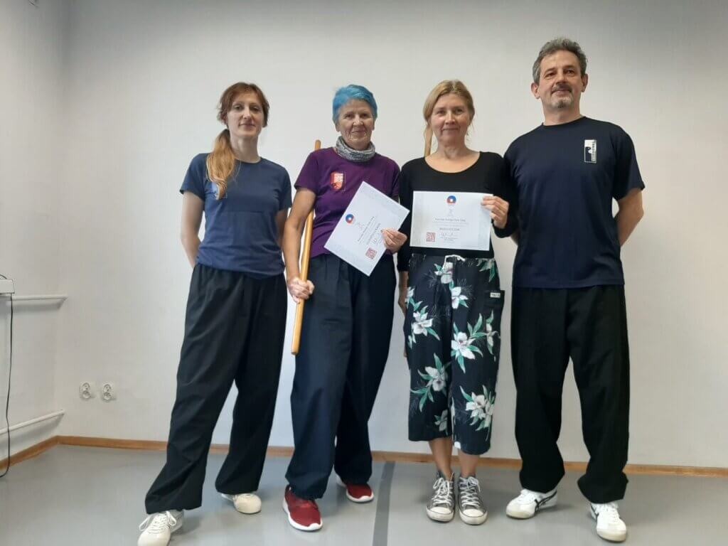 Jak zawsze powtórki pokazywały nam ile kryje się dodatkowych detali w wolno i precyzyjnie wykonanym ruchu. Możemy być spokojni, że nauki jest jeszcze dużo przed nami. Uczciliśmy ten etap pracy certyfikatami białego poziomu kija i miecza. Staż trwał siedem tygodni wspólnych ćwiczeń w sobotnie poranki, oraz wcześniej ponad trzyletnimi treningami, co weekend, na świeżym powietrzu, w parku. Jesteśmy z Was z dumni, za determinację i pracę nad sobą poprzez doskonalenie form broni. Serdecznie gratulujemy!